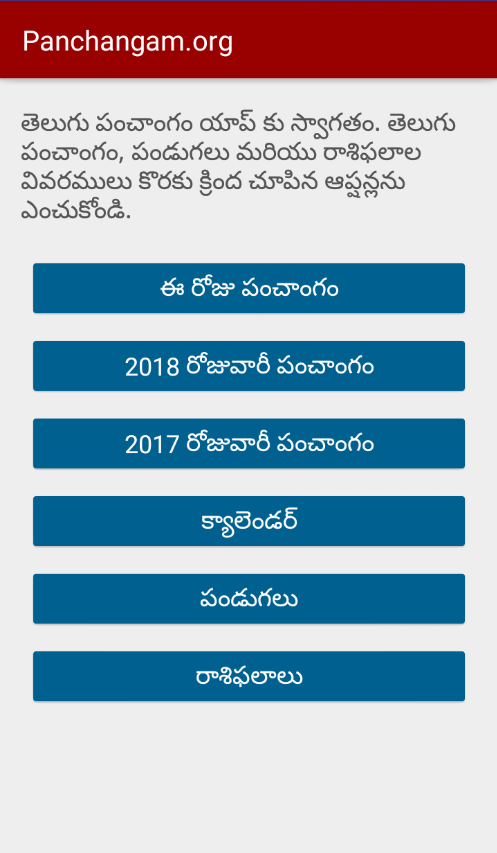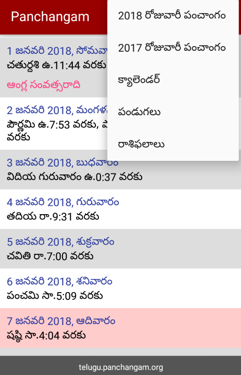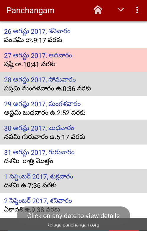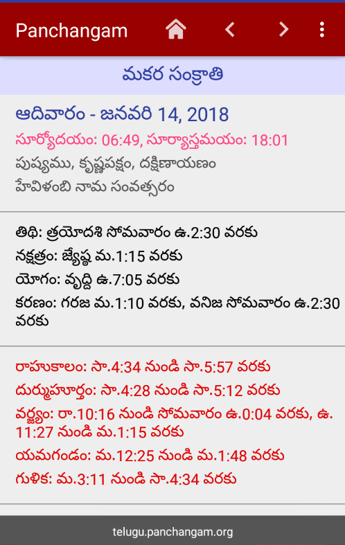 Free 2017 Telugu Panchangam App contains Hindu Panchangam Calendar with Tithi, Vara, Nakshatra, Yoga and Karana. It also shows times to avoid (Rahukalam, Varjyam, Durmuhurtam, Yamaganam etc) and auspicious times (Amritakalam, Abhijit muhurtam etc).