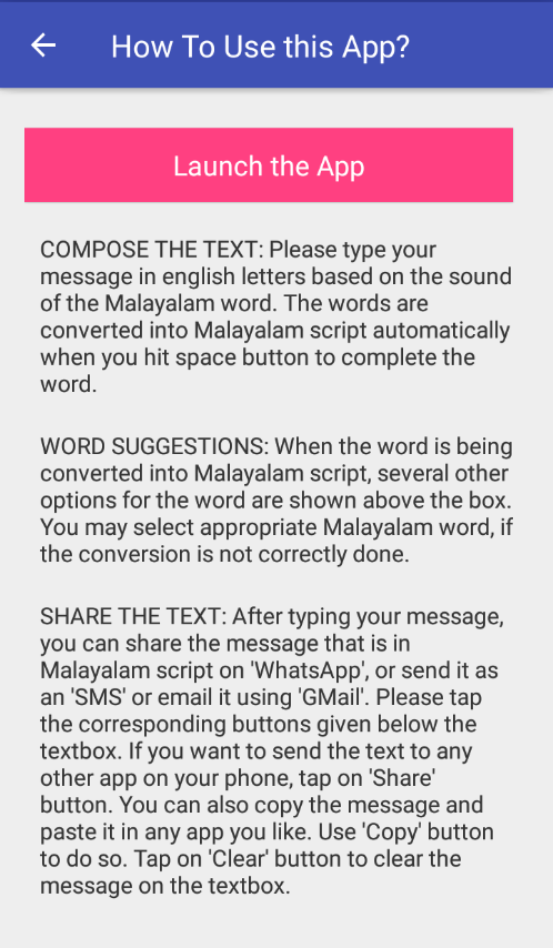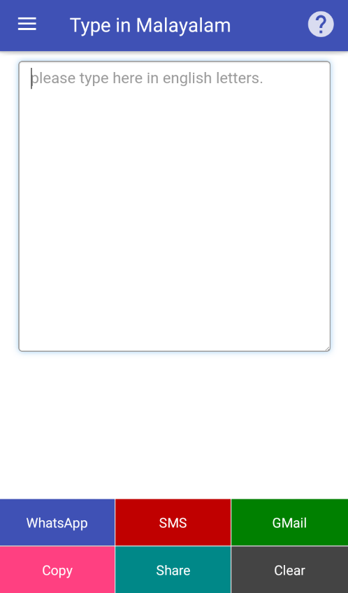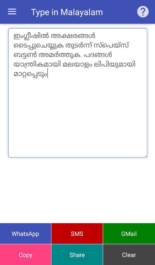 Using this app you can now easily share messages in malayalam script on your WhatsApp groups, send SMS messages in Malayalam, Send Emails in Malayalam and use Malayalam language in any app that supports utf-8 encoding.