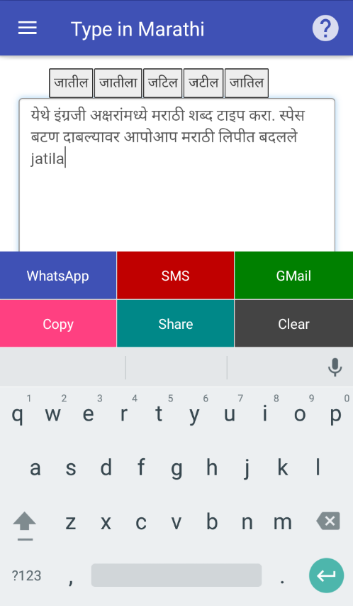 Using this app you can now easily share messages in marathi script on your WhatsApp groups, send SMS messages in Marathi, Send Emails in Marathi and use marathi language in any app that supports utf-8 encoding.