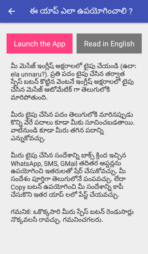 For example if you type 'ela unnaru' it will be converted into Telugu script as 'ఎలా ఉన్నారు'. After typing the word in english based on the sound of the telugu word, just hit the space button and the word will be converted automatically into Telugu script.