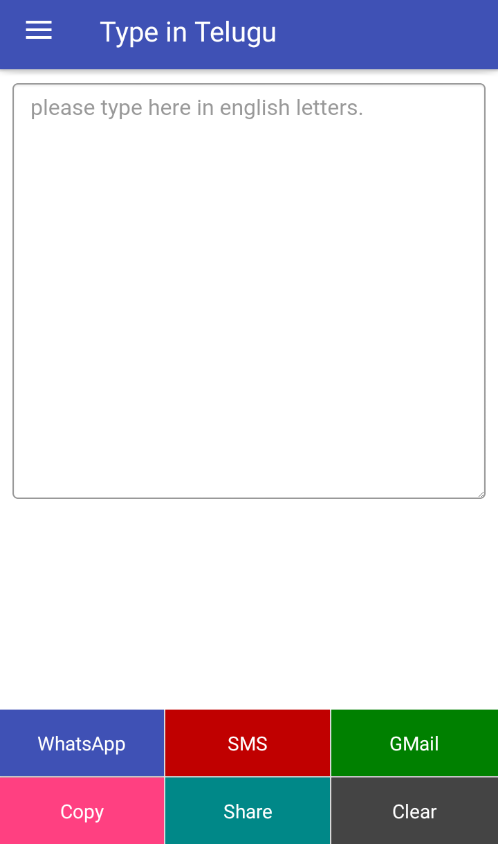 'Type in Telugu' app allows you to share and store the converted Telugu script using any app on your phone such as WhatsApp, SMS Messages, GMail Messages, Saving as Documents, Copy the text and paste in other apps etc