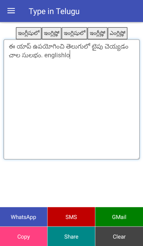 Using this app you can now easily share messages in telugu script on your WhatsApp groups, send SMS messages in Telugu, Send Emails in Telugu and use telugu language in any app that supports utf-8 encoding.